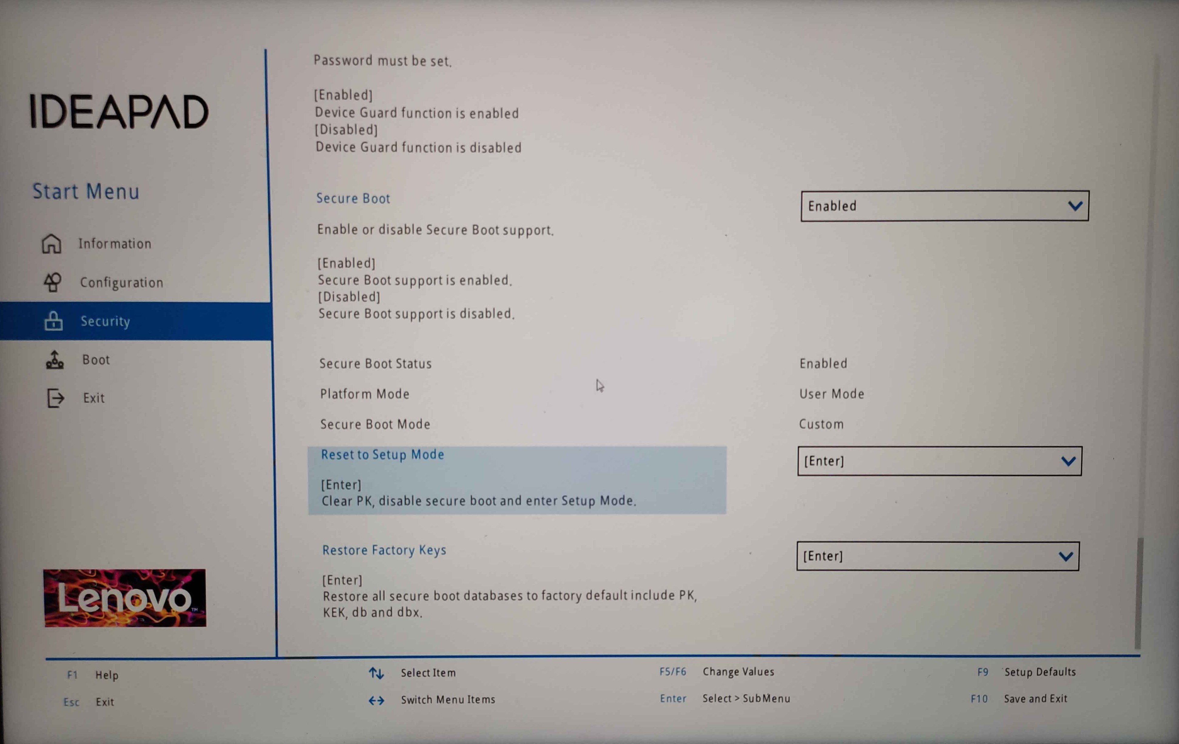 This is how the BIOS looks like on a Lenovo Ideapad 5 Pro. Reset to setup mode or restore factory keys and reboot back to the system